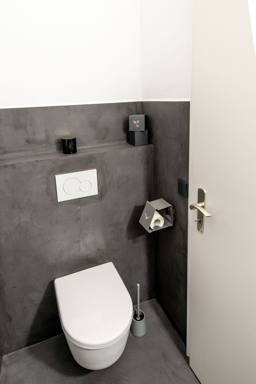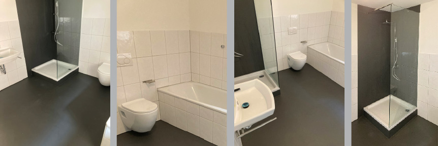 Hier konnten die weißen Fliesen an den Wänden übernommen werden, der Bodenbelag wurde in einem dunklen Schiefergrau überspachtelt. Durch die fugenlose Badgestaltung erhält der Raum eine deutlich hochwertigere Anmutung.